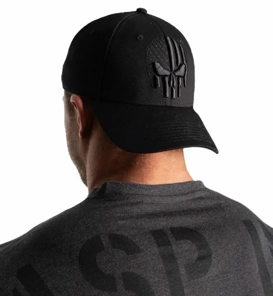 Traditional baseball cap with adjustable buckle, GASP Relentless Skull logo on the front, cotton band around inside