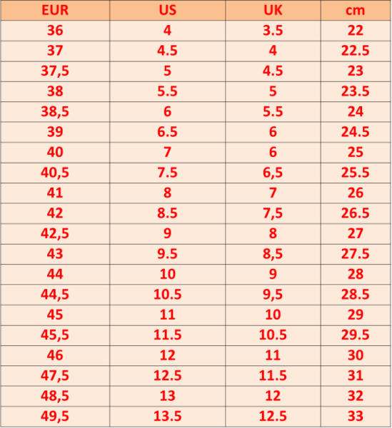 | Model | US 6,5 (EUR 39), US 7 (EUR 40), US 7,5 (EUR 40,5), US 8 (EUR 41), US 8,5 (EUR 42), US 9 (EUR 42,5), US 9,5 (EUR 43), US 10 (EUR 44), US 10,5 (EUR 44,5), US 11 (EUR 45), US 11,5 (EUR 45,5), US 12 (EUR 46), US 12,5 (EUR 47), US 13 (EUR 48,5), US 13,5 (EUR 49,5), US 4 (36), US 4,5 (36,5), US 5 (37,5), US 5,5 (38), US 6 (38,5) |
